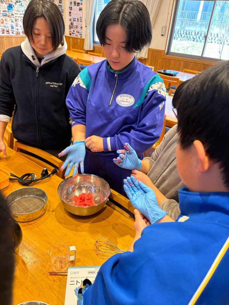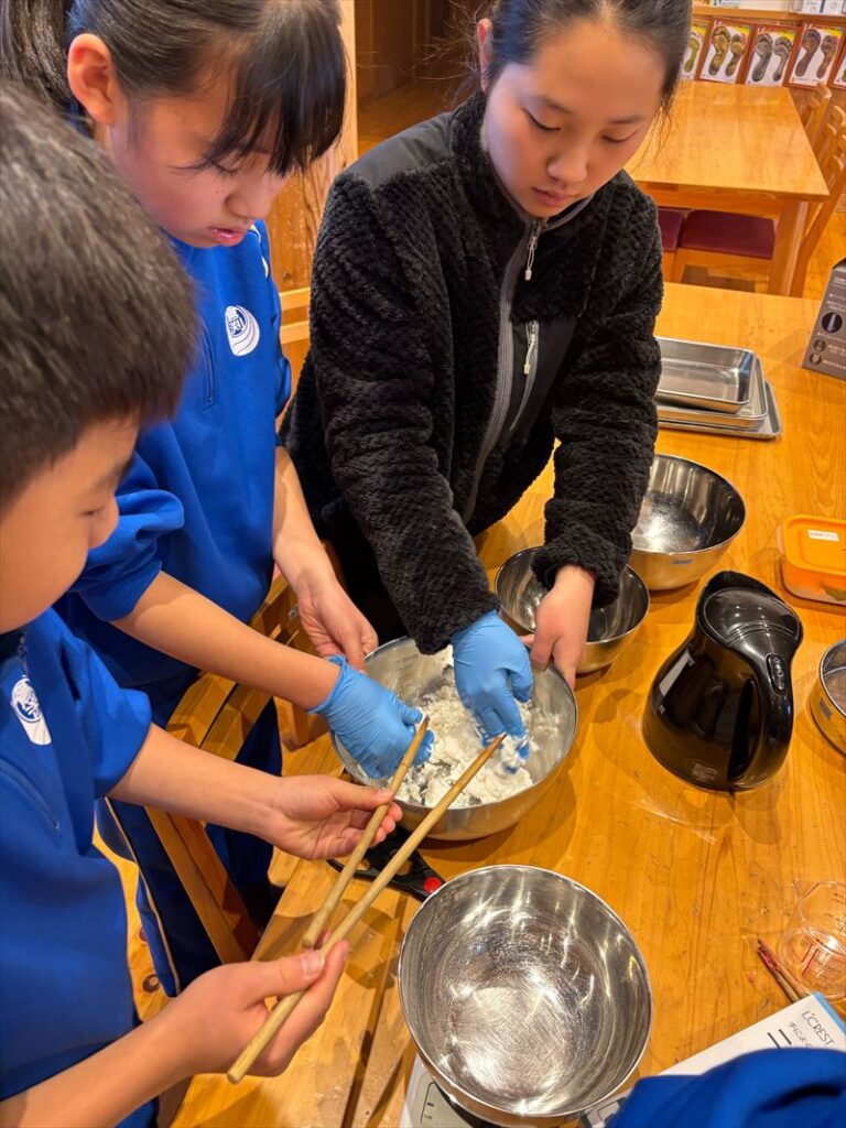 繭玉は紅白色にしてていねいに一つひとつこねて繭の形をイメージして作ったよ!