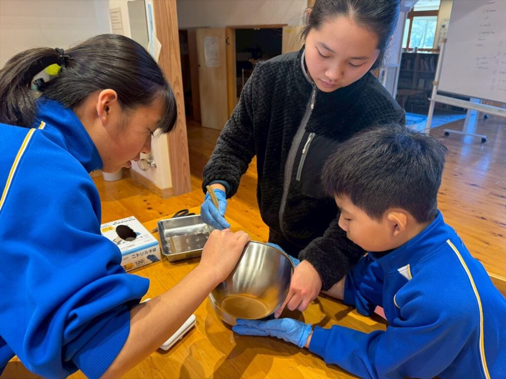 午前中は2チームに分かれ、繭玉づくりと小屋づくりをしました。