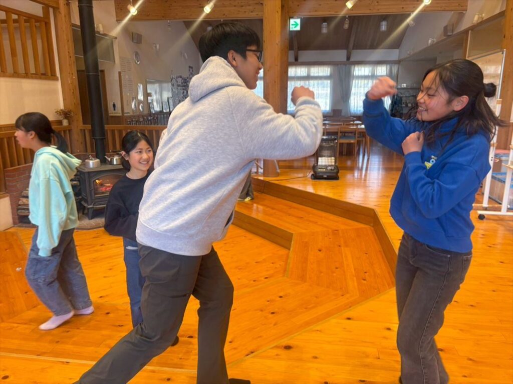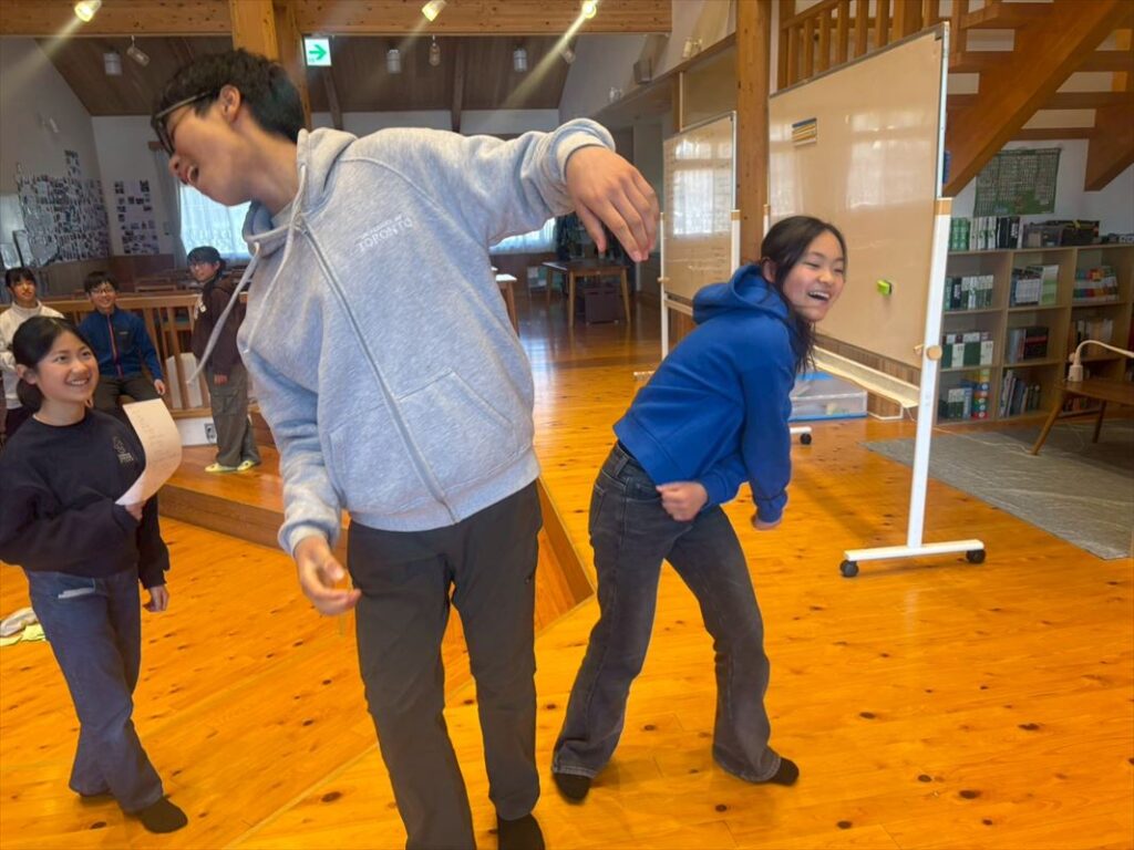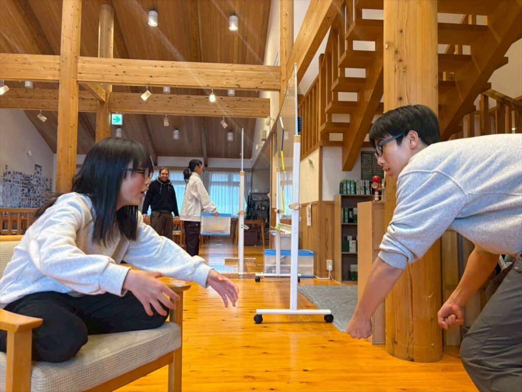 午後は、Eyes, Ears, Mouthというゲームをしました。一人だけお題を伝えられ、自分が使えるパーツが限られている中で、自分とは別のパーツが使えない相手に意思疎通してみよう!というゲームです。