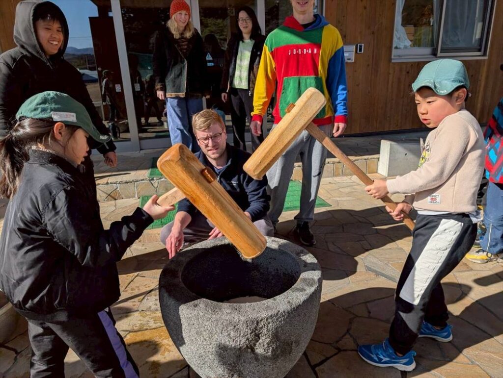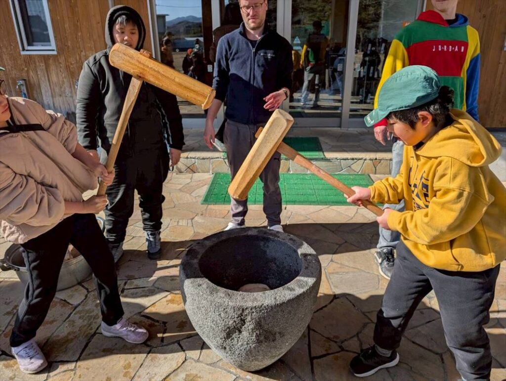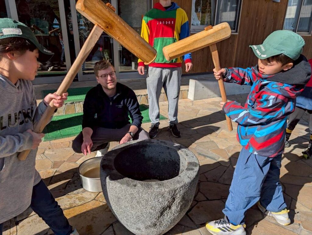 餅づくりが日本の文化に根付いた話を聞いた後は、早速餅をつき始めます!!!