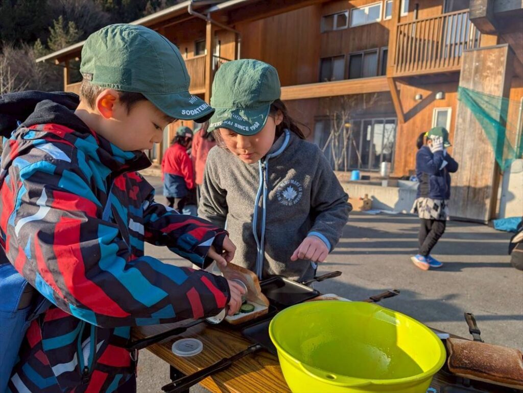 朝から頑張って、火を起こして朝ごはんを作ります。ハムチーズホットサンドは、焦がさないように慎重に焼いていました。