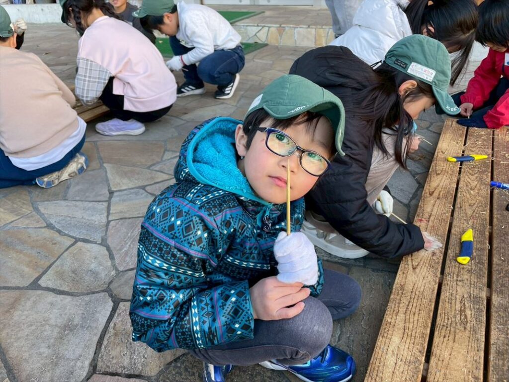 身体を動かした後は、夜のマシュマロ焼きに使う串づくりをしました。ナイフ一本と竹で自分だけの串を作りました。