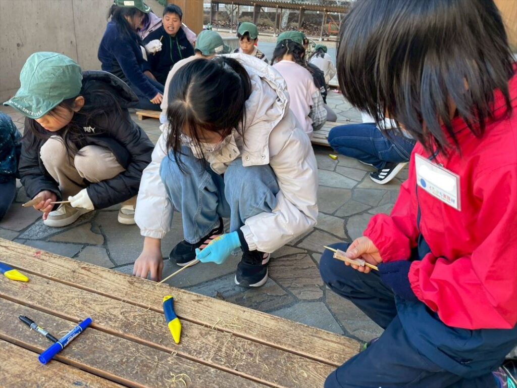 自分たちで作った手づくり串にさして、焼けるのを待ちます。
