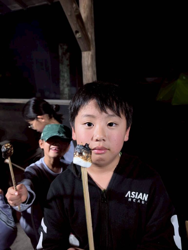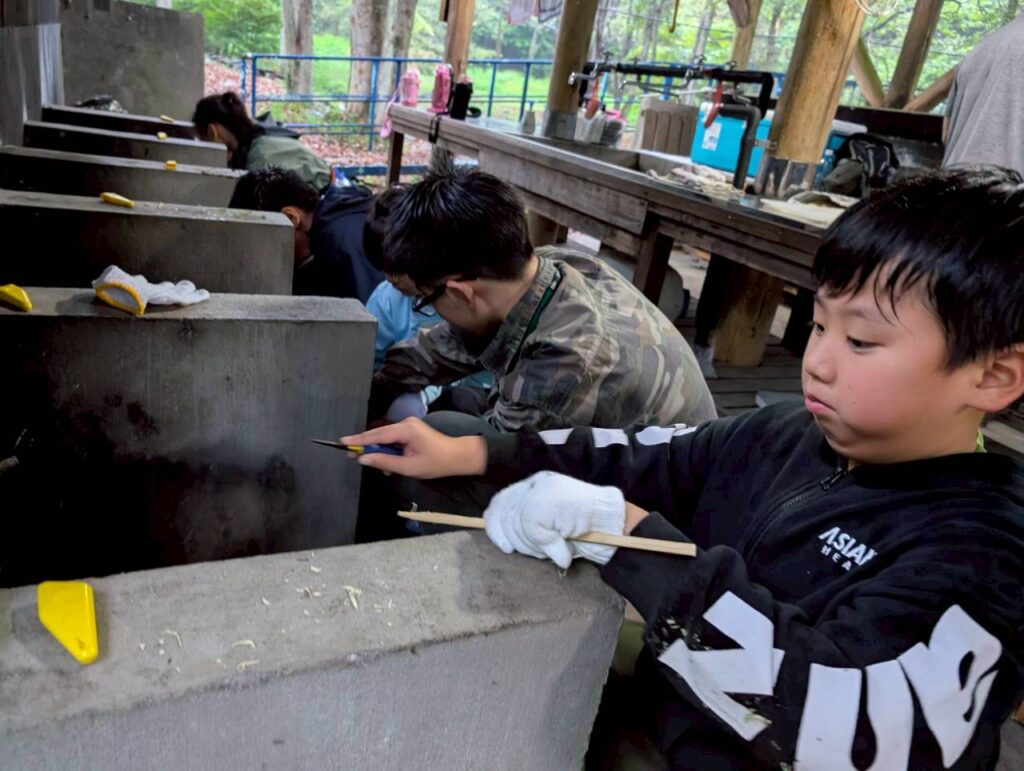 その後、夜のマシュマロ焼きに使う串づくり。ナイフ一本で自分だけの串を作りました。