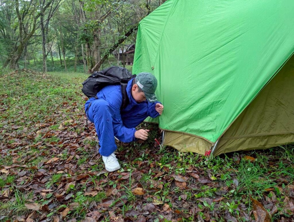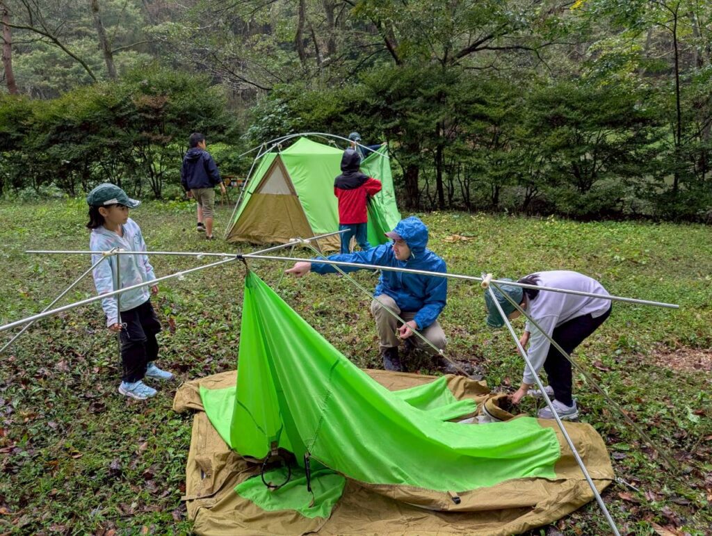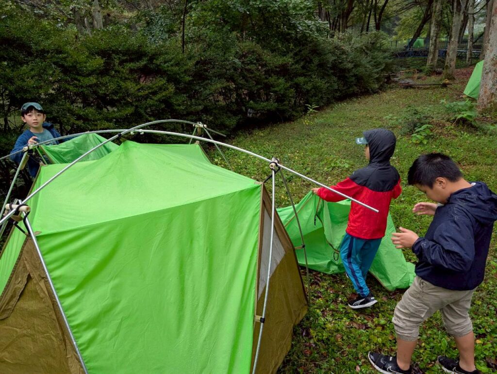 英語村に到着した後、ご飯を食べてキャンプ場へ。雨が降る前にテントを立てました。