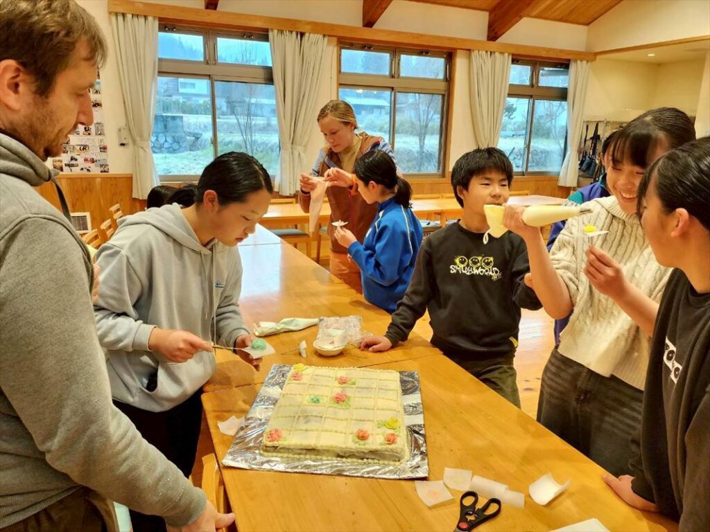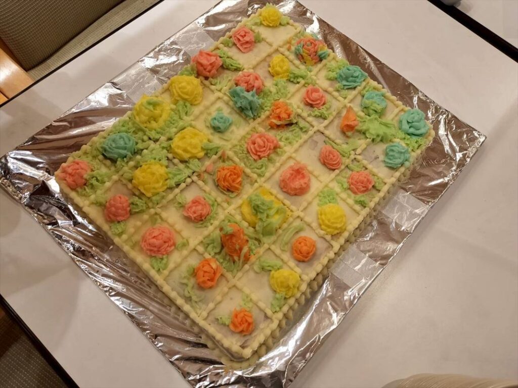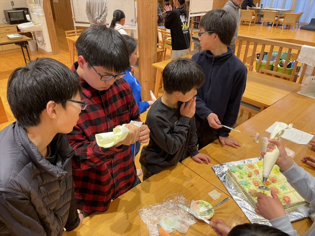 自分たちでアイシングをし、ケーキに花を咲かせました。