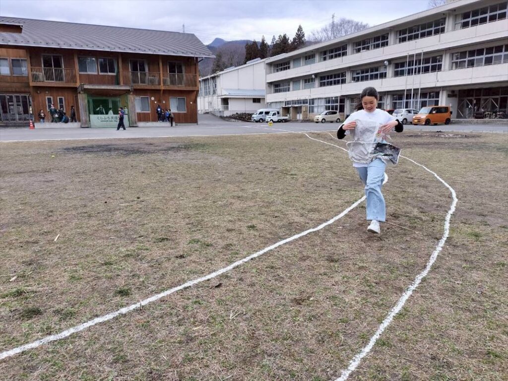 新聞を落とさないよう体に張り付けて走ったり、縄跳びを飛び回ったりする競技です。