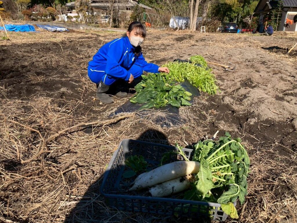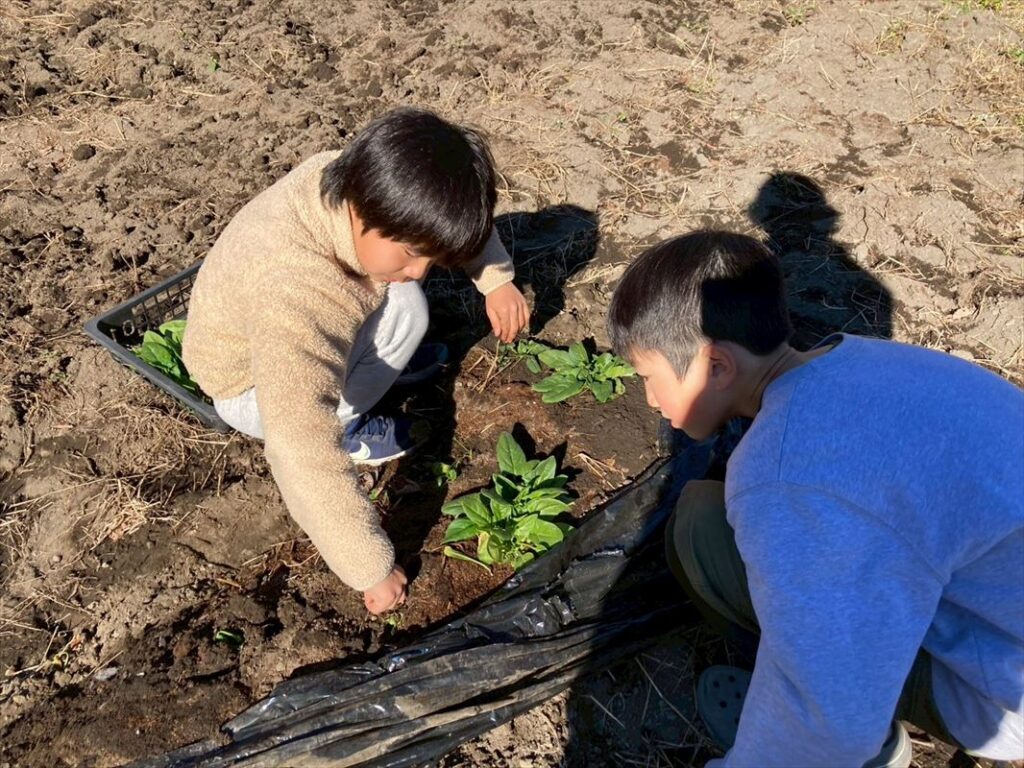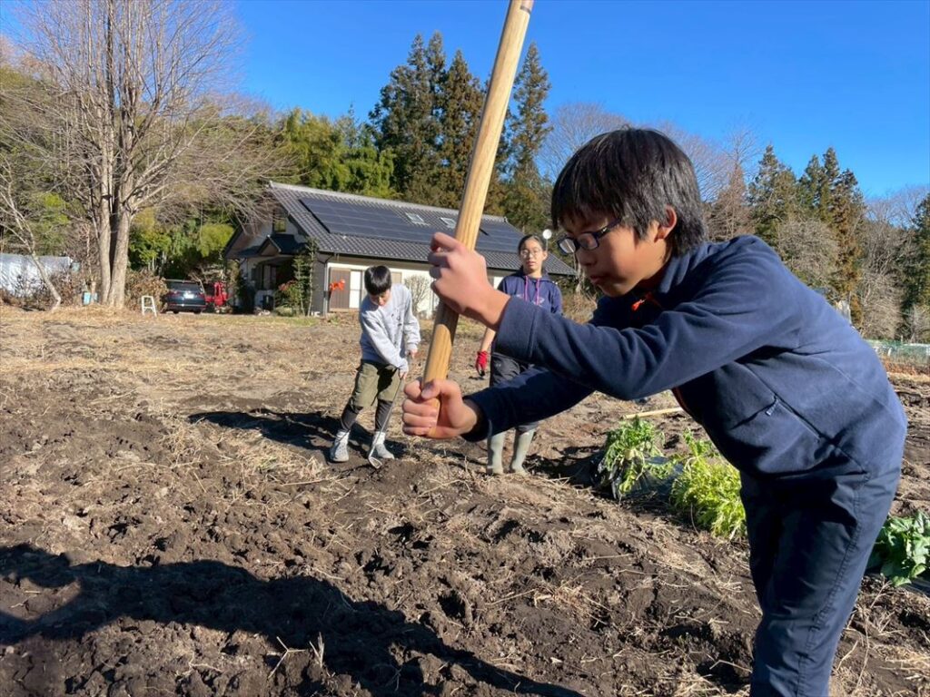 子ども達は「これかたすぎて、鍬が土に入らないよ!」、「収穫し損ねた野菜たち、もう美味しくなくなっちゃったかも」と、季節の移り変わりを実感しながら、土を耕していました。