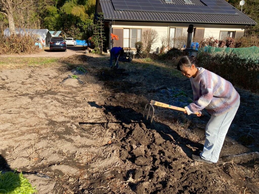 倉渕ではこの間初雪が降り、日陰は土が凍り始めているので、畑の土もカチコチに。