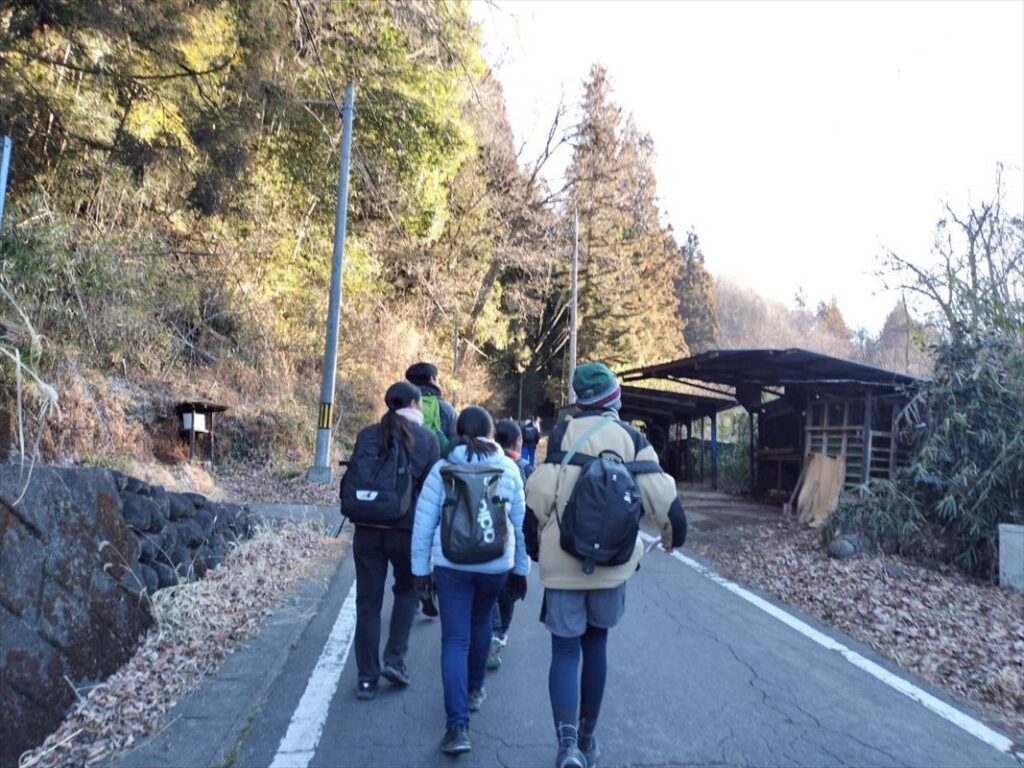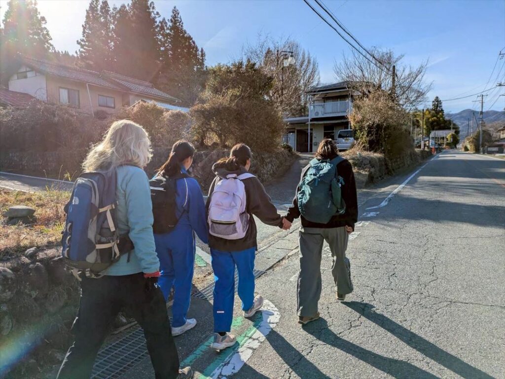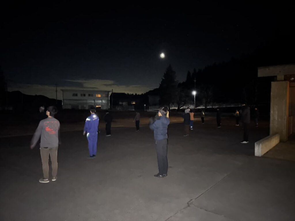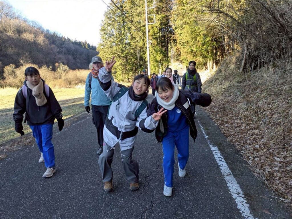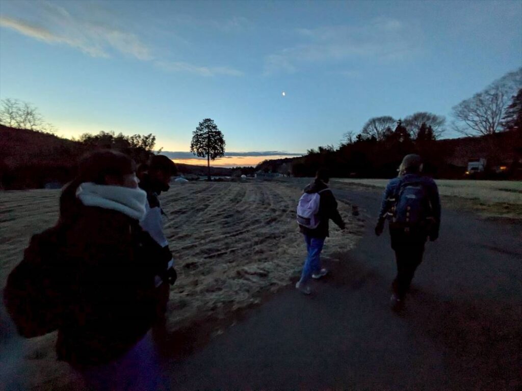 小学生がいつも通る通学路を通過して、道の駅に向かいます。およそ6kmの道のりを悠々歩く子ども達。段々周りも明るくなってきました!