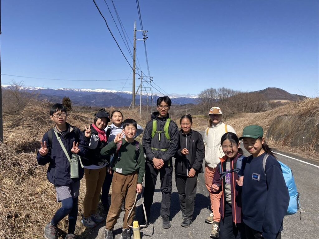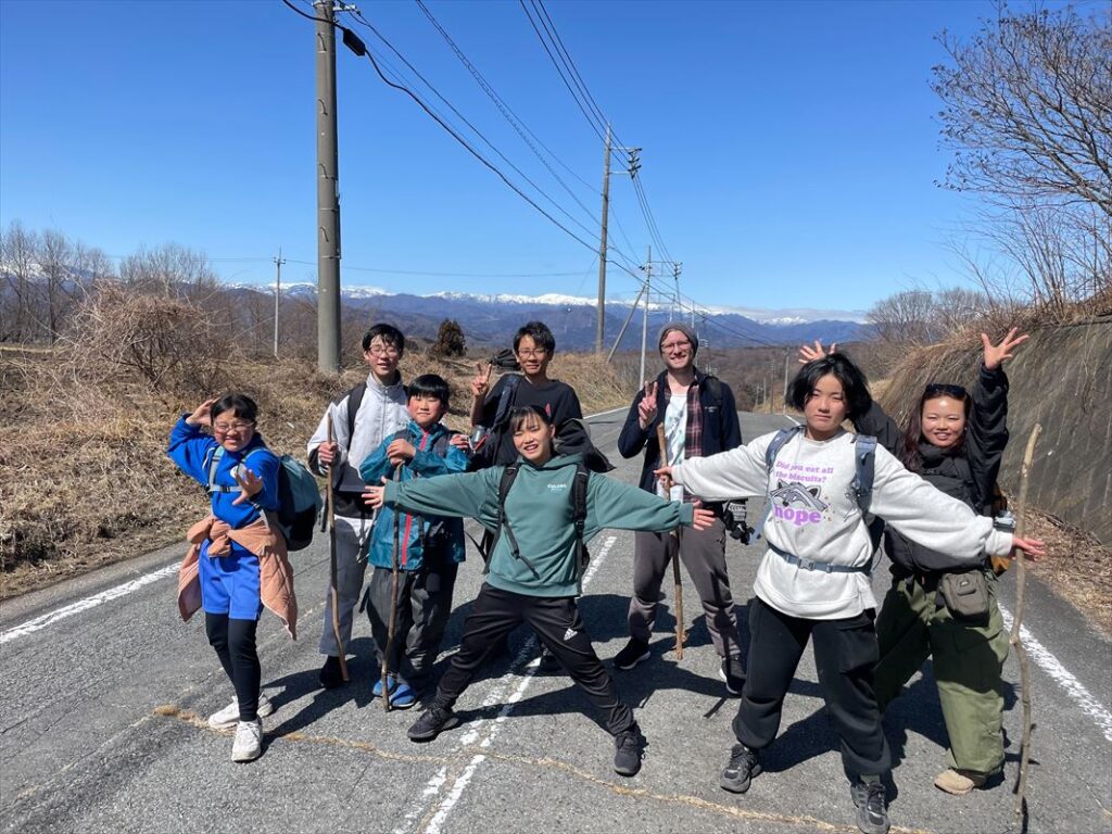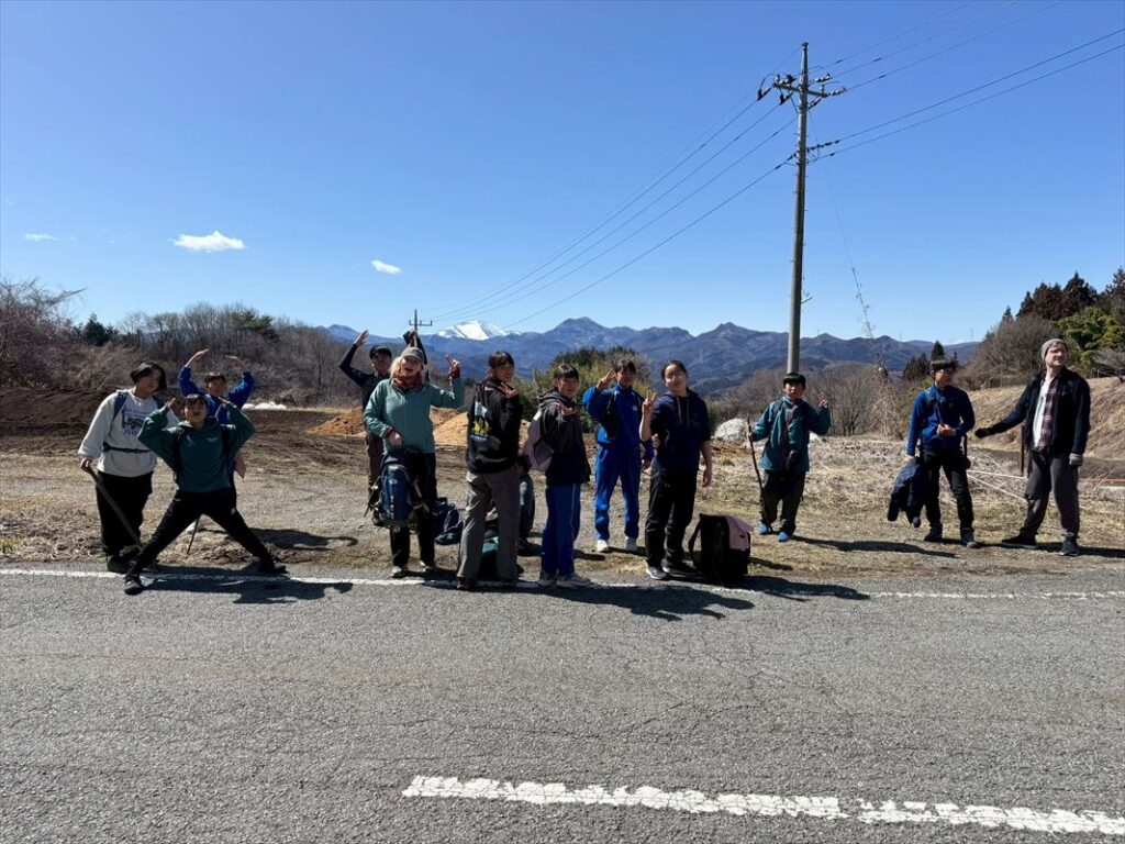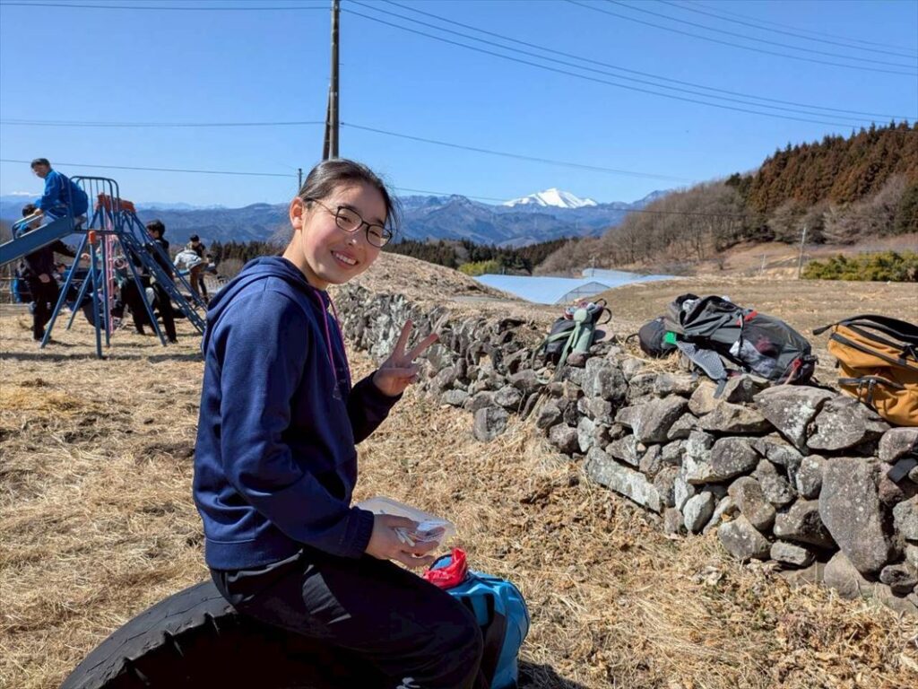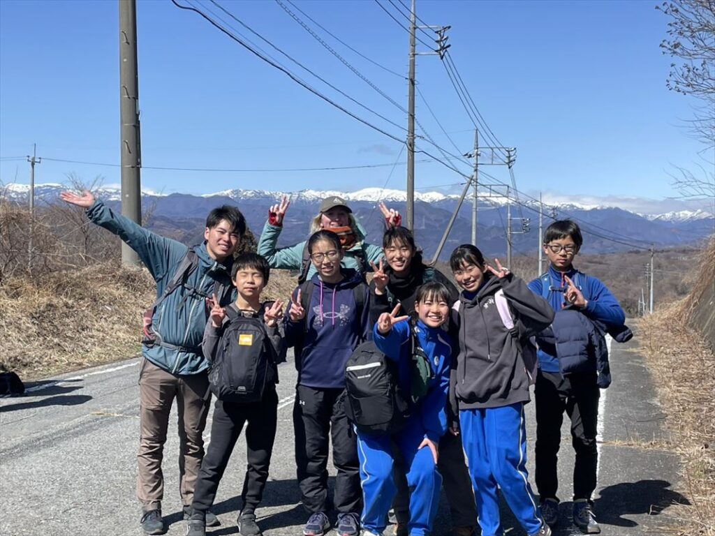 腹ごしらえをして、チームごとに出発します。途中、浅間山、谷川岳などの雪山が広がり、疲れてきた子供たちも景色に元気をもらいます。