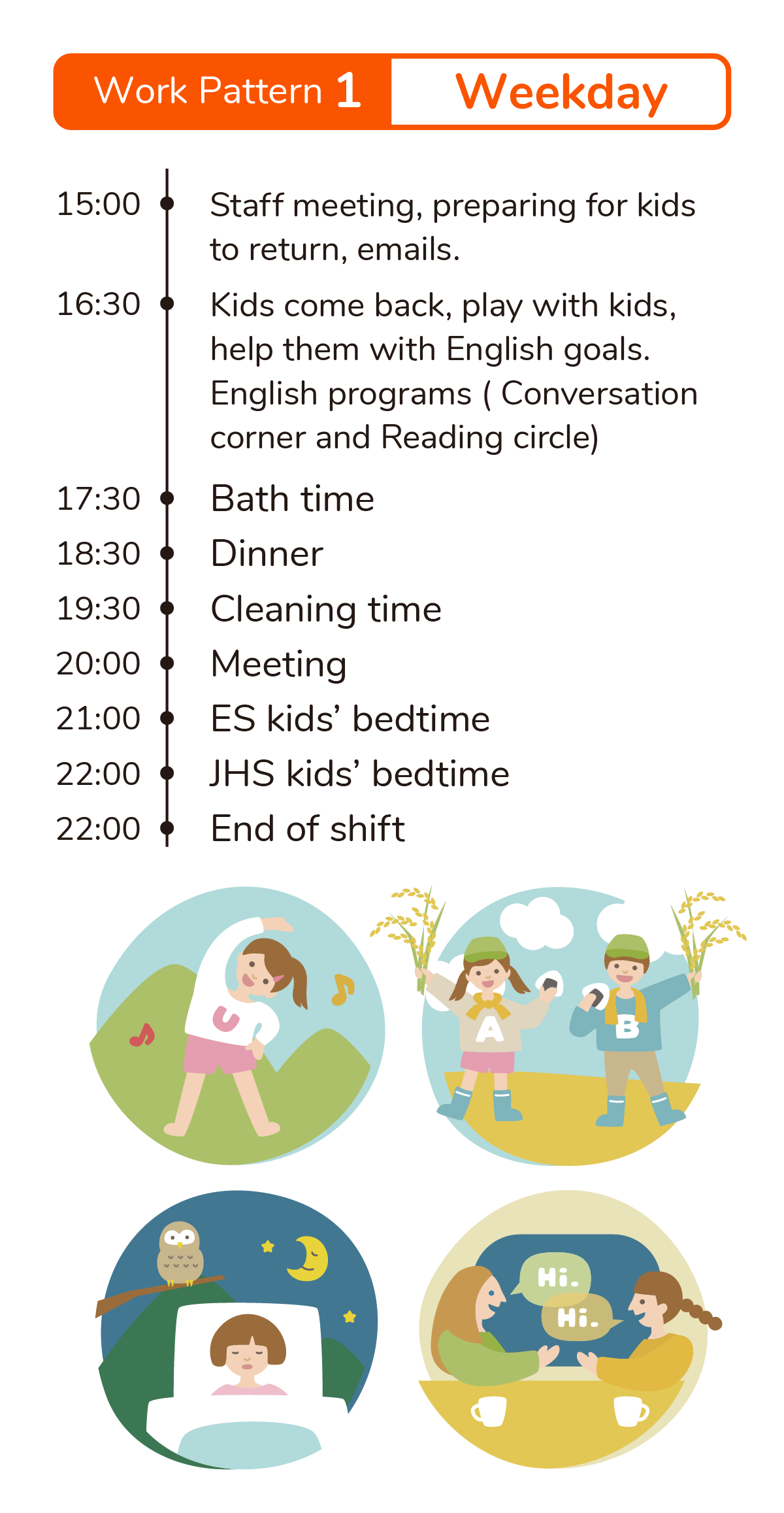 Our international staff come from all over the world (the US, UK, Canada, China) and our Japanese staff and the kids come from all over Japan (from Hokkaido to Nagasaki prefecture). By spending the year together with them they have the chance to learn about a diverse range of values. Since staff work in shifts, each employee has a lot of discretion which I think is very rewarding.
