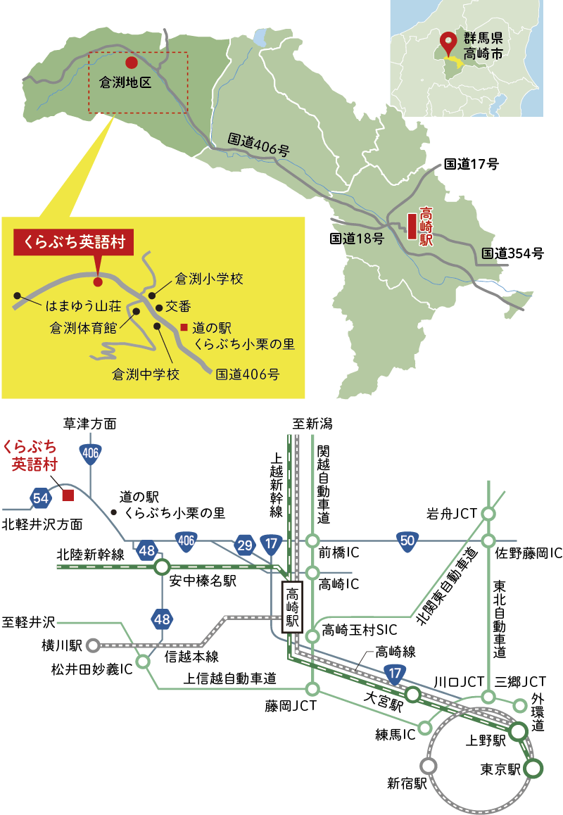 Kurabuchi English Village is a mountain village study away facility for elementary and junior high school students where they live in an English environment. It was started as a partnership program between Takasaki City and Sodaterukai, a public interest incorporated foundation and the first organization to start a mountain village study away initiative in Japan. This is a domestic English study away facility that took an old abandoned school area and built an all-wood dormitory, where children can participate in a variety of activities and enjoy daily life in English with international staff. While living here kids can improve their practical English skills, along with gaining a sense of independence, compassion, and passion for life.